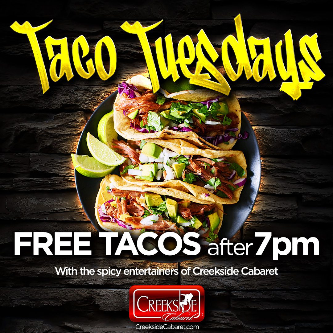Join your Creekside Cabaret Entertainers on Tuesdays after 7:00PM EST for Free Tacos! The night lasts until 2:00AM EST