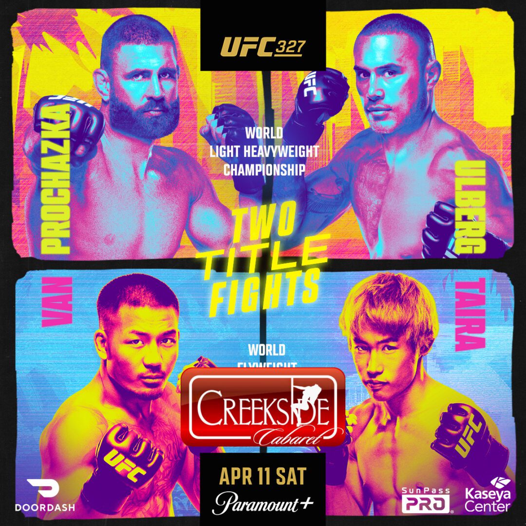 Join your Creekside Entertainers for UFC 327 Prochazka vs Ulberg on Saturday April 11. 2026 starting at 9:00 PM EST. The hard hitting action lasts until 2:00AM EST at Creekside Cabaret.